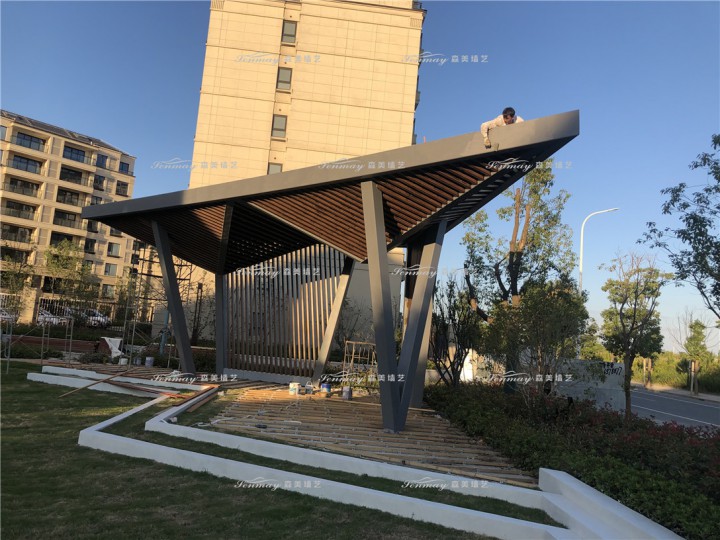 上海浦东新区南汇新城钢构廊架仿木纹漆施工案例